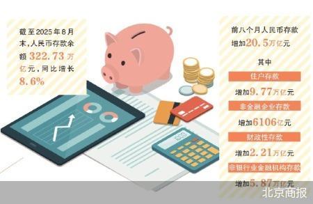 从年内数据来看,截至2025年8月末,人民币存款余额322.73万亿元,同比增长8.6%。前八个月人民币存款增加20.5万亿元。其中,住户存款增加9.77万亿元,非金融企业存款增加6106亿元,财政性存款增加2.21万亿元,非银行业金融机构存款增加5.87万亿元。